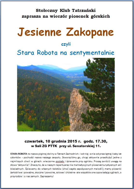 29.X.2015 r. Informacja dla członków SKT... Działając na podstawie Regulaminu SKT zarząd klubu na zebraniu w dniu 22 października 2015 r. podjął uchwałę o dokoptowaniu do swojego składu kol. Martę Pielech i powierzył koleżance prowadzenie spraw finasowych klubu. 26.X.2015 r. Na stronie SKT... W niedzielę 25 października obchodziliśmy Ireniadę w chacie w Ławach. Tekst laudacji i fotoreportaż z tego wydarzenia zamieściliśmy w dziale "do popatrzenia" 10.X.2015 r. Na stronie SKT... 4 października, przy pięknej pogodzie obchodziliśmy w chacie w Ławach MIchałki Kampinoskie. Krótki fotoreportaż z tego wydarzenia zamieściliśmy w dziale "do popatrzenia" 05.X.2015 r. SKT poleca... ![]() Zamieszczoną w dziale "do popatrzenia" relację z wernisażu wystawy Jana Szarana w SKT uzupełniliśmy o kilka prac autora. 24.IX.2015 r. Prelekcje w SKT... 8 października prelekcją Janusza ŻELAZIŃSKIEGO pt. NAUCZMY SIĘ ŻYĆ Z POWODZIAMI I SUSZAMI -TAKI MAMY KLIMATrozpoczynamy jesienny sezon prelekcji w Stołecznym Klubie Tatrzańskim. Prelekcje odbywają się w czwartki, w czasie spotkań klubowych - od godziny 1730, w sali konferencyjnej (I piętro) Zarządu Głównego PTTK, ul. Senatorska 11.