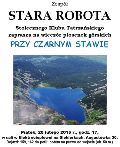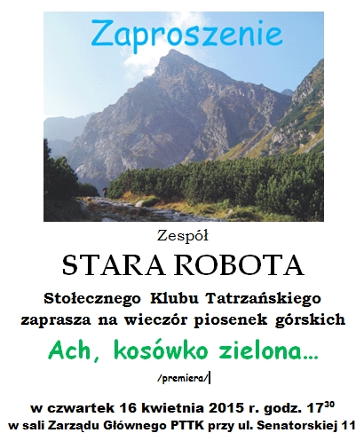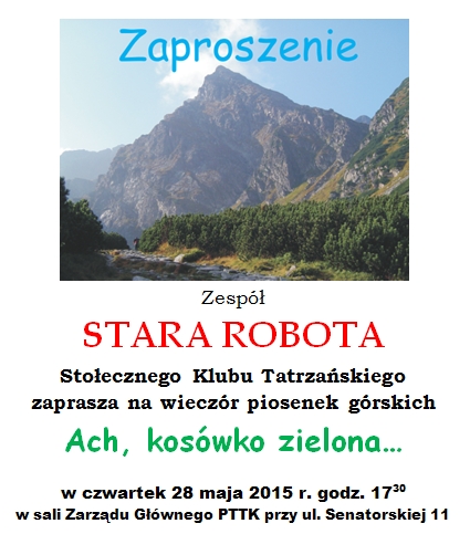 15.VI.2015 r. Na stronie SKT... W dziale " DO POPATRZENIA" zamieściliśmy tekst dytyrambu i kilkanaście zdjęc z obchodów 45 rocznicy Wklubowstąpienia Eli, które odbyły się w chacie w Ławach 14 czerwca 2015 r. 13.VI.2015 r. SKT poleca niespodziewany koncert STAREJ ROBOTY... ![]() 11.VI.2015 r. SKT poleca... ![]() SKT zaprasza... ![]() Wystawa będzie czynna od poniedziału do piątku w godz. 11 -18. do 31 sierpnia 2015 r. SKT zaprasza... ![]() 19.V.2015 r.