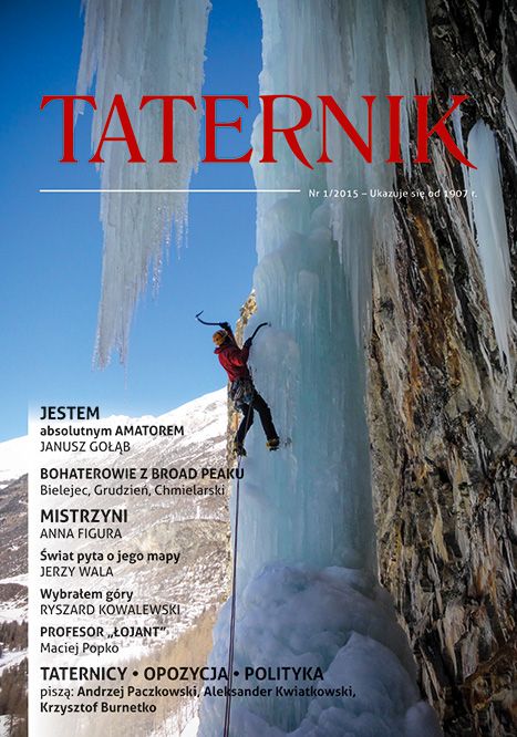 A na okładce „Fot. Jarosław Woćko Na okładce Jarosław Skowron na drodze Hard Ice Direct (WI 6, 200 m) w rejonie Cogne, dolina Aosty, Włochy. Drogę przeszedł z Jarosławem Woćko 25 lutego 2015 r. Zapraszamy na stronę internetową, dostępną pod adresem: http://www.taternik.org/ na której można dokonać zakupu kwartalnika oraz zaprenumerować czasopismo. 31.III.2015 r.