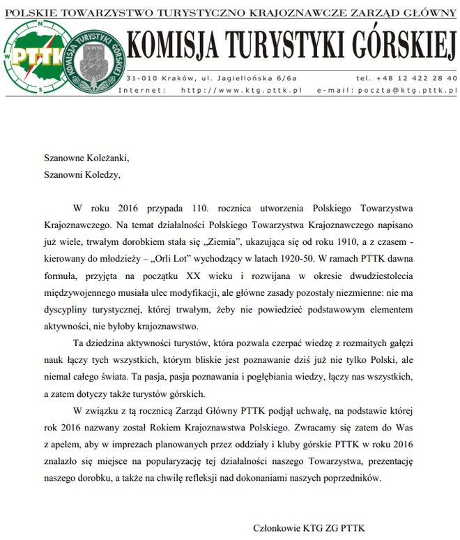 Poniżej zamieściliśmy treść pisma, które otrzymaliśmy od Komisji Turystyki Górskiej ZG PTTK