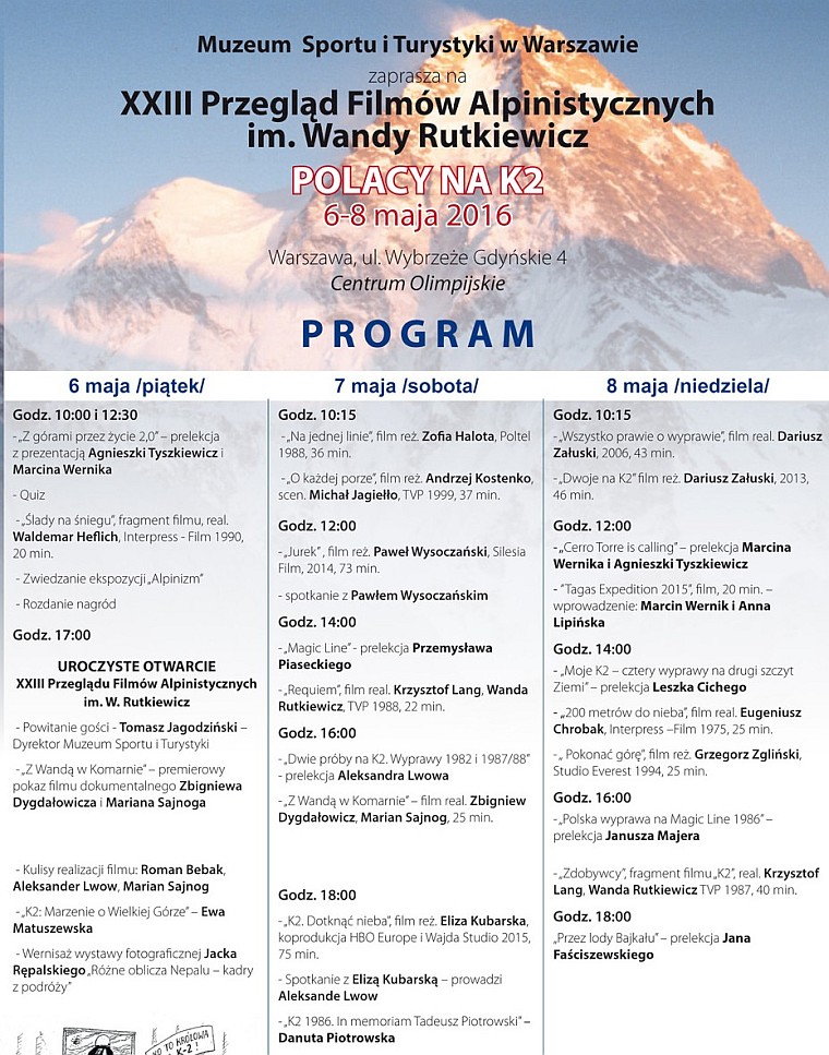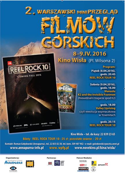 Obecna edycja składa się z czterech seansów, podczas których zaprezentujemy kilka naprawdę godnych polecenia filmów. Głównym atutem jest oczywiście ostatnia edycja słynnej serii filmów wspinaczkowych REEL ROCK 10. Przy okazji przypomnimy też wspaniały film Valley Uprising, który stanowił 9 edycję tej serii, a którego pokaz na naszym Przeglądzie cieszył się ogromnym zainteresowaniem. Nasz repertuar uzupełniają także dwa filmy rozgrywające się w Górach Wysokich K2 and the Invisible Footman (Niewidzialni tragarze spod K2) oraz Manaslu, czyli ostatni film Jerzego Porębskiego nawiązujący do historycznego pierwszego zimowego wejścia Polaków na ten szczyt........