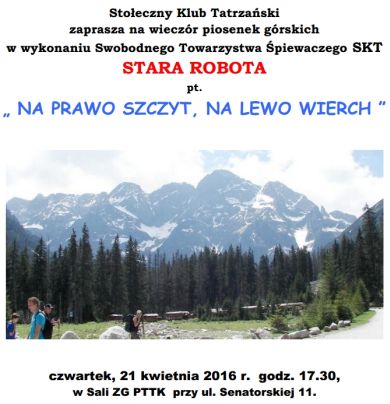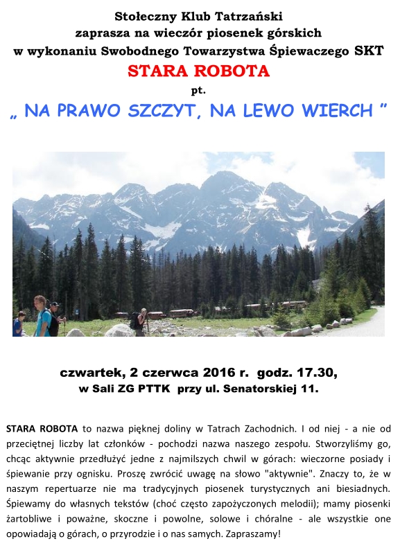 5.XII.2016 r. Informacja dla członków klubu Odbyło się pierwsze posiedzenie Zarządu SKT, wybranego podczas Walnego Zgromadzenia Członków 24 listopada, 2016 roku. Skład Zarządu po ukonstytuowaniu: 26.XI.2016 r. Informacja dla członków klubuZ dniem 1 stycznia 2017 roku Zarząd Główny PTTK wycofuje z obiegu znaczki do legitymacji PTTK sprzed 2012 roku. W związku z tym członkowie Klubu, którzy chcieliby zakupić takie znaczki proszeni są o zgłoszenie zamówień na znaczki Ewie Dmowskiej lub Ewie Byszewskiej-Szpocińskiej do dn. 15 grudnia 2016 roku. Po tej dacie realizacja zakupu znaczków PTTK sprzed 2012 roku będzie niemożliwa. 21.XI.2016 r. SKT poleca ...