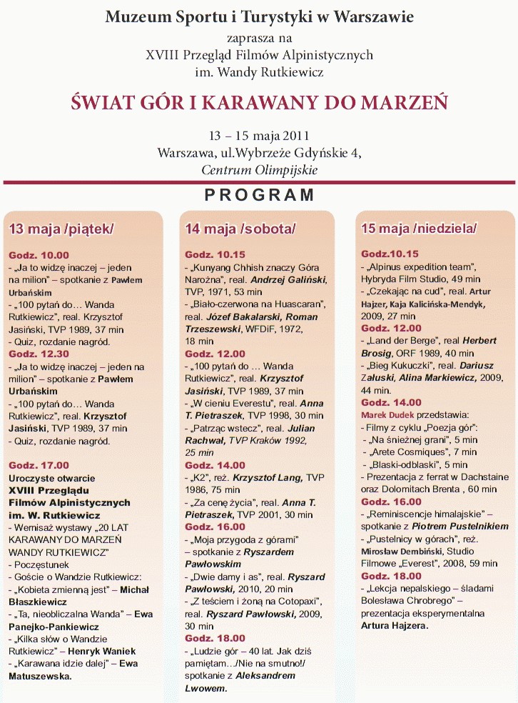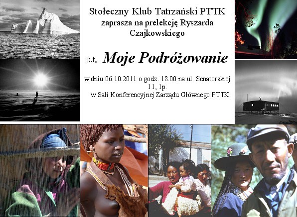 W programie: rodzinna podróż na Kubę, rowerowa wyprawa Jedwabnym Szlakiem, opowieść o australijskich Aborygenach, fascynująca przyroda wschodniej Polski, wędrówki po zachodniej Turcji, żeglarska ekspedycja po Arktyce, eksploracja mniej znanych Chin, odkrywanie tajemnic Sudanu. więcej informacji: „tutaj” 16.XI.2011 r. ZAPROSZENIE ... SWOBODNE TOWARZYSTWO ŚPIEWACZE STOŁECZNEGO KLUBU TATRZAŃSKIEGO