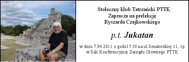 STARA ROBOTAma zaszczyt zaprosić na swój występ, który odbędzie się w kawiarni „Południk Zero” przy ulicy Wilczej 25 (między Marszałkowską a Kruczą) 25 listopada br. o godz. 19 09.XI.2011 r. ZAPROSZENIE... 31.X.2011 r. INFORMACJA Trwa akcja zbiórki funduszy na leczenie i rehabilitację Macieja Stańczaka. Prowadzi ją Fundacja Wspierania Alpinizmu Polskiego im. Jerzego Kukuczki. ![]() Zwracamy się z prośbą o pomoc dla naszego przyjaciela Macieja Stańczaka. W trakcie niedawno zakończonej wyprawy na Makalu doznał on odmrożeń 3 i 4 stopnia. Tak silne uszkodzenia wymagają amputacji, lekarze nadal walczą o to by zmniejszyć skutki odmrożeń, lecz z każdego palca zostanie usunięty jakiś fragment. Przed Maćkiem bardzo długa droga do osiągnięcia zdrowia i sprawności, leczenie oraz rehabilitacja wymagają dużo czasu i znacznych nakładów finansowych, które przekraczają możliwości jego rodziny. Magdalena Bregin Więcej informacji o Maćku i wyprawie na Makalu tutaj 30.X.2011 r. Prelekcje w SKT Zapraszamy na drugą część prelekcji Cezarego Bugajczyka "W poszukiwaniu końca świata" ![]() Prelekcje odbywają się w czwartki, w czasie spotkań klubowych - od godziny 18-tej, w sali konferencyjnej (I piętro) Zarządu Głównego PTTK, ul. Senatorska 11 Więcej informacji o planowanych prelekcjach w SKT zamieszczamy: tutaj 25.X.2011 r. SKT poleca... Niedawno minęło 30 lat od wyprawy Polskiego Klubu Górskiego, która zdobyła dziewiczy południowo-zachodni wierzchołek Masherbrumu (7806 m), ale zakończyła się jedną z większych tragedii w historii polskiego himalaizmu. Z tej okazjii ukazał się ciekawy artykuł Janusza Kurczaba zachęcamy do przeczytania: „tutaj” 24.X.2011 r. Na stronie SKT ... W dziale „Do obejrzenia” zamieściliśmy Tekst Toastu wygłoszonego przez Redaktora Naczelnego oraz fotki z Imienin Irenki obchodzonych tradycyjnie w Puszczy w niedzielę 23.X.2011 do nowej strony na skróty: „tutaj” 19.X.2011 r. Na stronie SKT ... W dziale „Do poczytania” zamieściliśmy relację Teresy Starczewskiej z październikowych wycieczek grupy członków SKT po Mazowieckim Parku Krajobrazowym, 10.X.2011 r. Informacja SKT ![]() Ogólnopolska Akcja "Poznaj Beskidy" serdecznie zaprasza na ogólnopolski II Rajd Górski Szlakami Beskidzkiej 5, który odbędzie się w dniach 19-20 listopada 2011 r. Więcej informacji o Rajdzie: tutaj 03.X.2011 r. Prelekcje w SKT "W poszukiwaniu końca świata" - Cezary Bugajczyk ![]() Wyjazd do Republiki Sacha - Jakucji dziewięć lat temu, pod hasłem poszukiwania końca świata, zapoczątkował fascynację Autora Dalekim Wschodem Rosji. Podczas sześciu wypraw wraz z kolegami zdobył nawyższy czynny wulkan Kamczatki - Kluczewski, włóczył się autostopem po Kołymie odwiedzając kopalnie złota, strategiczną Magadańską Elektrownię Wodną, czy porzucone więzienia Archipelagu GUŁAG. W końcu dotarł na Czukotkę, gdzie poznał smak mięsa z wieloryba upolowanego przez morskich myśliwych. Poznał również "czukockiego Tatara" - Timura, z którym odbył potem wyprawę rowerową między dwoma oceanami: Pacyfikiem i Oceanem Lodowatym. W trakcie pokazu Czarek opowie o zmaganiach z przeładowanymi rowerami podczas przemierzania szutrowej drogi na "Dalekim Zachodzie", o przecięciu 180 południka z Kołem Polarnym, o napotkanych ludziach, pieczeniu chleba w baraku na pustkowiu, uboju reniferów, trekkingu w dzikiej tundrze i zdobyciu najwyższej góry Czukotki. Zapraszamy. 30.IX.2011 r. Otwieramy jesienny sezon prelekcji w SKT 17.IX.2011 r. Na stronie SKT ... Z przyjemnością informujemy o fakcie „reaktywacji” działalności twórczej Redaktora Naczelnego Wiadomości SKT. 13.VI.2011 r.