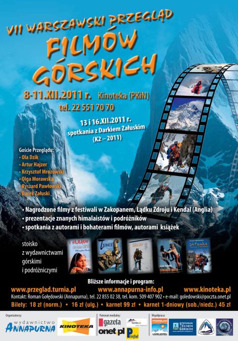 Warto zwrócić uwagę na kilka pozycji o charakterze kulturowo-przyrodniczym. Do tej grupy zaliczyć można takie filmy jak: Tulku z krainy Dolpo - o tybetańskiej społeczności mieszkającej w Nepalu; Koń Everestu - o wyjątkowym koniu, który zastępuje na szlaku pod Everest narowiste jaki, a niekiedy ratuje wręcz życie chorym turystom; czy - Mongolska krew - inny film związany z rączymi rumakami. W naszym repertuarze znalazły się też dwa znaczące filmy drogi: Ekspedycja Wisła - dokumentujący dwie wyprawy kajakowe z biegiem Wisły Marka Kamińskiego, oraz 180 o na południe - pełen romantyzmu obraz o wyprawie szlakiem dawnej ekspedycji na pewien trudny szczyt w Patagonii. Miłośnicy podwyższonej dawki adrenaliny także znajdą coś dla siebie. Film Pavlo Barabasza Trou de Fer (Żelazna dziura) pokazuje pełen dramatyzmu zjazd na linach w najtrudniejszy kanion świata na wyspie Reunion, natomiast polską eksplorację w tym stylu przedstawi Krzysztof Mrozowski, który wraz z ekipą dokonał przejścia ostatnich dziewiczych kilometrów kanionu Colca w peruwiańskich Andach. Dla ludzi szukających w górach czegoś więcej, aniżeli tylko emocji związanych z pokonywaniem skrajnych trudności, mamy do zaproponowania trzy filmy, w których wspinaczka jest jedynie tłem do ukazania głębszych ludzkich motywacji. W tej grupie z największym rozmachem zrealizowany jest bezsprzecznie obraz Pokonać siebie, prezentujący młodą kobietę, która zapragnęła przeistoczyć się w alpinistkę dokonującą ekstremalnych wyczynów. Ważny jest też film Świątynia marzeń, którego bohaterem jest pewien alpinistyczny dysydent w mocno sformalizowanym radzieckim alpinizmie. Do tej puli zaliczyć też można obraz Elizy Kubarskiej Co się wydarzyło na wyspie Pam, pokazywany na naszej imprezie ponownie, a to z powodu burzy medialnej, jaka rozpętała się w ostatnich miesiącach wokół kulisów realizacji tego bezsprzecznie ciekawego filmu. W gronie filmów alpinistycznych warto zwrócić uwagę na: nową produkcję Jerzego Porębskiego Kukuczka, gdzie o legendarnym polskim wspinaczu wypowiadają się takie sławy światowego himalaizmu, jak Reinhold Messner czy Kurt Diemberger; The Pinnacle - prezentujący dwa pokolenia szkockich wspinaczy, porównanie stosowanych technik i podejścia do wspinaczki; słoweński Sfinks - zrealizowany z dużym rozmachem inscenizacyjnym oraz z niebanalnym zamysłem. Z pewnością fani ekstremalnej wspinaczki nie będą czuli się rozczarowani, choć jest to obraz dziejący się w wielu warstwach. Zapewne to jeden z najciekawszych filmów tej edycji naszego przeglądu. Już po zamknięciu programu uzyskaliśmy zgodę na pokaz ciekawego filmu hiszpańskiego Thumbnail, kręconego podczas wspinaczki na ten sam grenlandzki klif, na który wspinali się Dawid Kaszlikowski z Elizą Kubarską. Wstęp do tego filmu wygłosi Dawid Kaszlikowski. Film został włączony do sobotniego bloku rozpoczynającego się o 20.15. Ważną rolę w naszej imprezie odgrywają spotkania ze znanymi alpinistami. W tym roku będziemy mogli posłuchać górskich opowieści w wykonaniu: Oli Dzik - nadziei kobiecego himalaizmu Artura Hajzera - niegdyś partnera Kukuczki, a obecnie lidera programu „Polski himalaizm zimowy 2010-2015” Ryszarda Pawłowskiego - zdobywcy wielu ośmiotysięczników, w tym trzykrotnie Everestu, dziś jednego z najbardziej znanych przewodników wysokogórskich. Darka Załuskiego - od początku wspinającego się z kamerą, by dokumentować wyczyny polskich i zagranicznych alpinistów. Tym razem opowie o tegorocznej wyprawie na K2, zakończonej spektakularnym sukcesem. Znacząca część repertuaru filmowego pochodzi z dwóch imprez filmowych o ugruntowanej pozycji - Spotkań z Filmem Górskim w Zakopanem oraz z Przeglądu Filmów Górskich w Lądku Zdroju im. Andrzeja Zawady. Pragnęlibyśmy niniejszym gorąco podziękować organizatorom tych imprez za udostępnienie kopii filmowych, a widzów zaprosić na te prestiżowe wydarzenia, odbywające się rokrocznie we wrześniu. < Roman Gołędowski więcej informacji o programie festiwalu: „tutaj” 07.XII.2011 r. SKT poleca ...