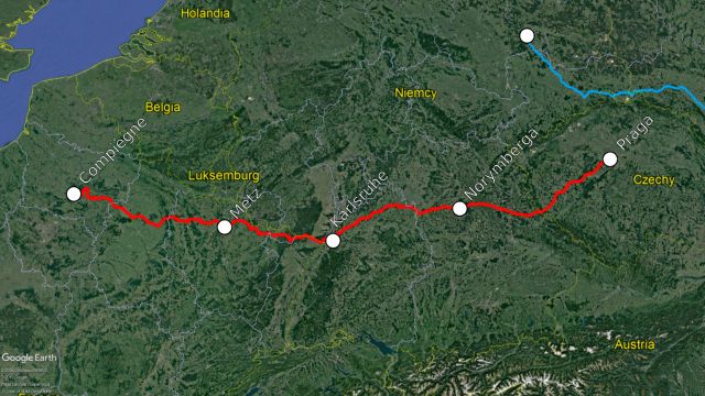 Zaznaczyłem początek i koniec, czyli Pragę i Compiegne, oraz trzy wybrane miasta pomiędzy. Chociaż tylko w Norymberdze zatrzymałem się na dwie noce, to jednak wyznaczały one ważne etapy mojej drogi. Starałem się też przyjść do nich niezbyt późnym popołudniem, by pozwiedzać i odpocząć. Na każdy z tych odcinków przypadał tydzień z hakiem.... Zapraszam na prelekcję!